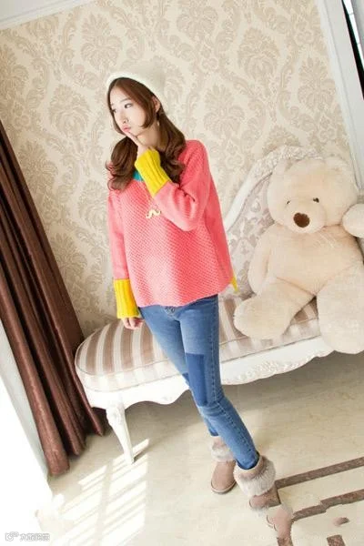 搭配示范:西瓜红色拼接毛衣+浅色牛仔裤+翻毛雪地靴+白色针织帽