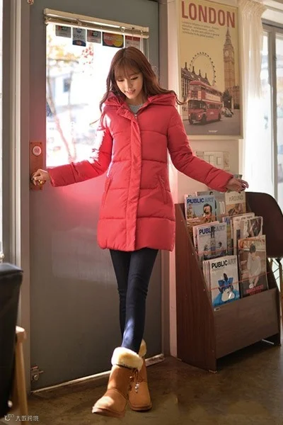 搭配示范:粉红色毛衣+蓝色棉袄+白色打底裤+棕色雪地靴