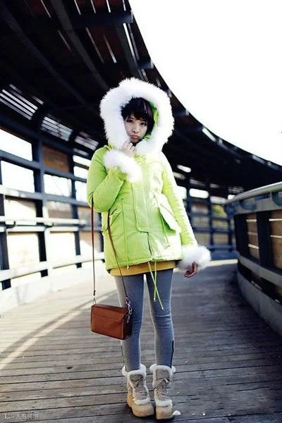 搭配示范:黄色内搭+绿色卫衣+灰色打底裤+系带雪地靴+棕色单肩包