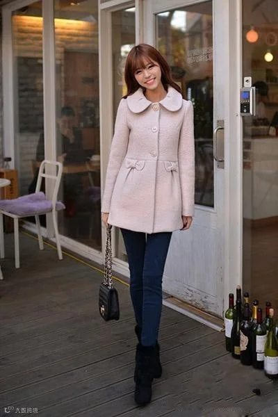 搭配示范:米色大衣+紧身裤+黑色翻毛雪地靴+黑色链条包
