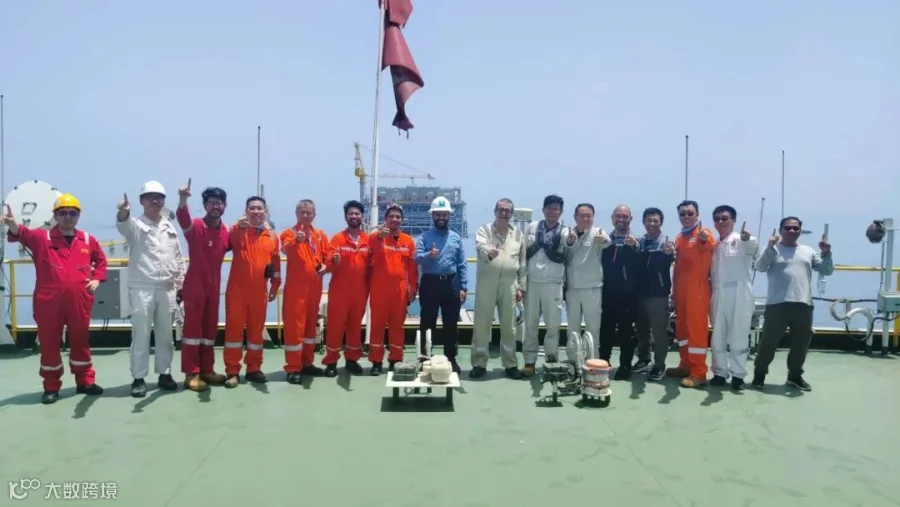 高质量推进海工服务总包项目执行!中东某大型浮托安装项目是船技工程第一个以EPC总包形式开展的浮托安装项目服务,今年,公司共计完成该项目4个航次相关工作,该图为项目成员在项目执行的第一座平台(第一航次平台)在完成浮托安装后的合影