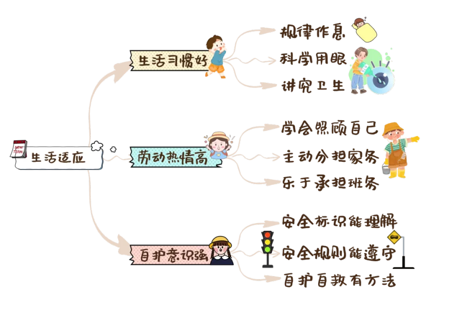养成良好的生活习惯,生活自理,参与劳动,增强安全防护能力等。