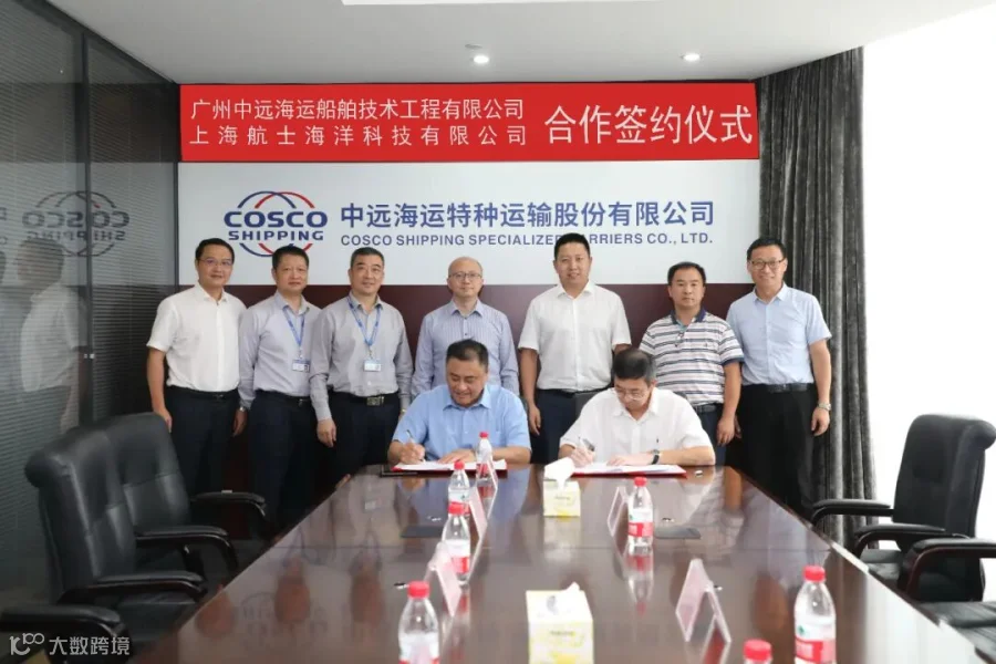 8月28日下午,广州中远海运船舶技术工程有限公司与上海航士海洋科技有限公司在广州远洋大厦举行战略合作签约仪式。中远海运特运副总经理董宇航、船管部总经理梁杰、货运技术中心总经理蔡连财,船技工程党委书记马云涌,上海航士总经理赵江鹏出席签约仪式并证签,船技工程总经理何向宁、上海航士董事长高延滨教授签约。