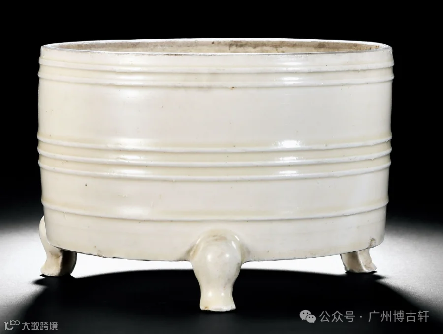 此三足尊实为罕见传世精品,尊直口,筒腹,平底,三蹄足。胎白质坚,除口沿一周露胎外,通体施白釉,釉色如象牙般柔和滋润。纹饰简朴,光洁的外壁上、中、下各饰多道凸弦纹,具韵律美。此尊造型简单大方,制作极其精致,器形甚为规整,仅口部一周无釉,覆烧法烧成,为定窑瓷中的罕见珍品。