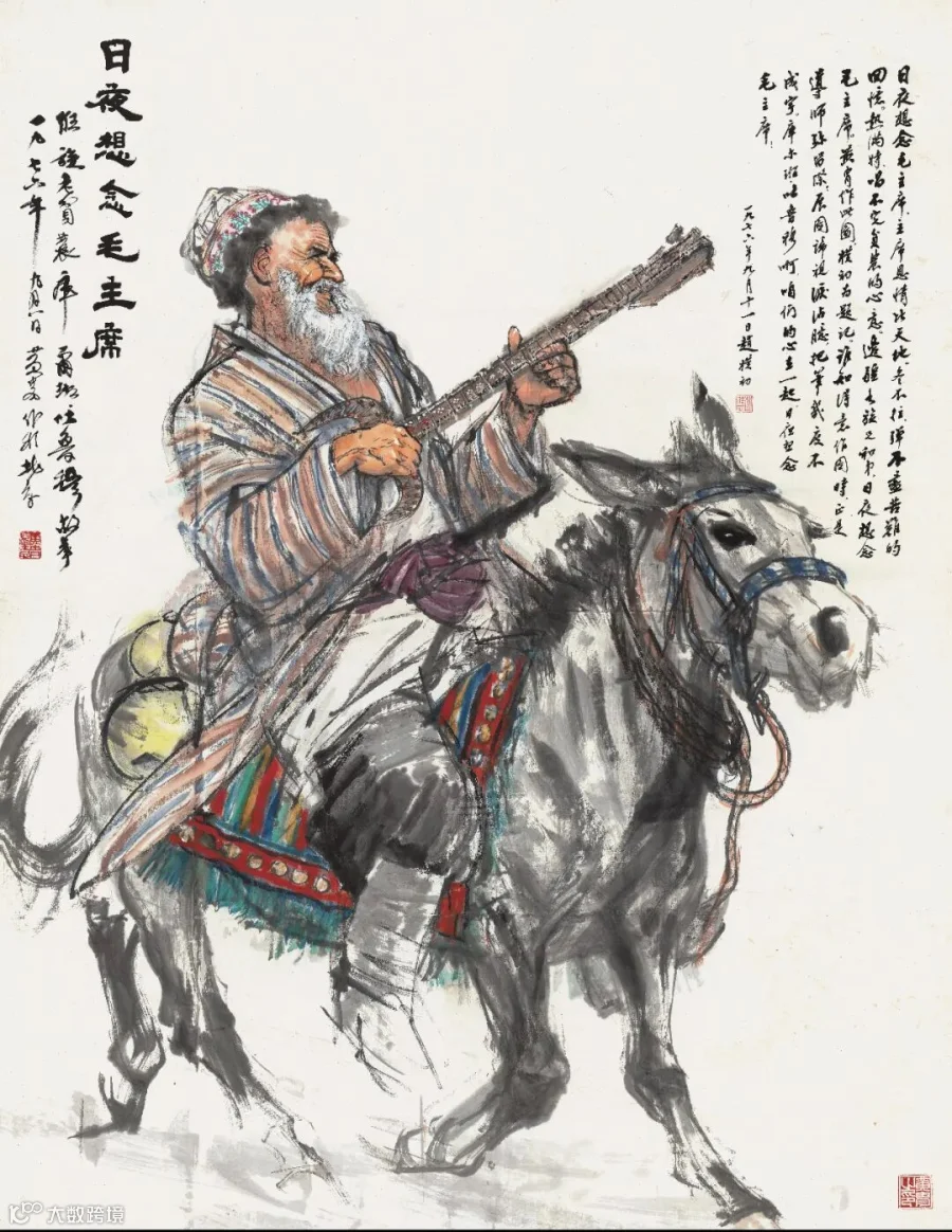 【赵朴初题跋】日夜想念毛主席,主席恩情比天地。冬不拉弹不尽苦难的回忆,热满特唱不完贫农的心意。边疆各族兄和弟,日夜想念毛主席。黄胄作此画,朴初为题记。谁知得意作图时,正是导师弥留际。展图谛视泪沾臆,把笔几度不成字。印文:赵朴初