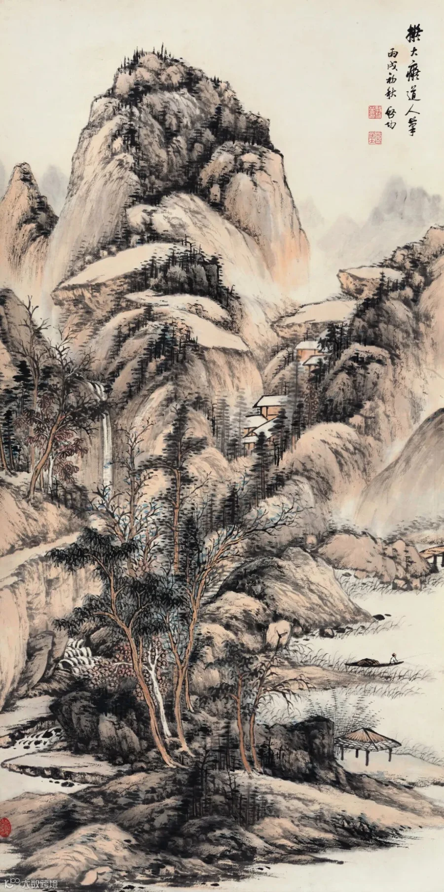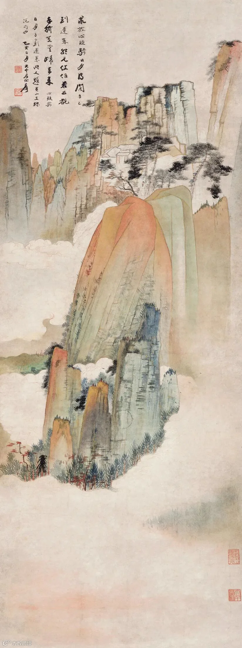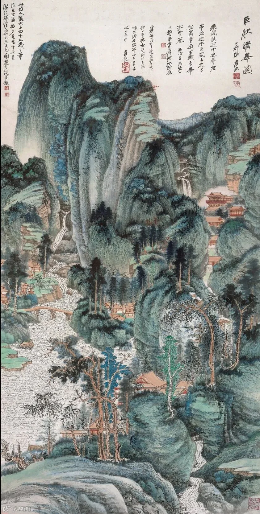 【谢稚柳题跋】此故人张大千四十九岁之笔,临巨然笔极少见,为其平生杰作,殊难得也。己巳夏初,谢稚柳观因题。印文:谢稚、稚柳