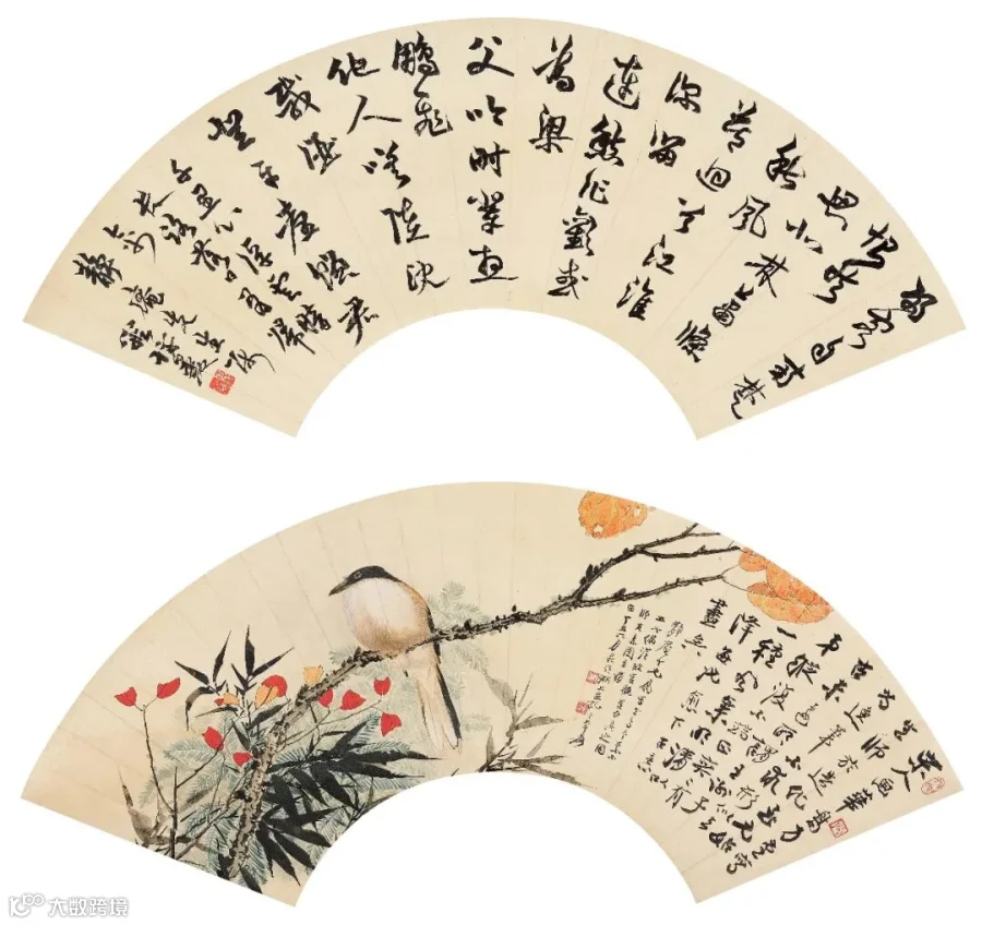 LOT 2275 张大千 罗复堪 仿崔白花鸟•行书「别王彻诗」 立轴