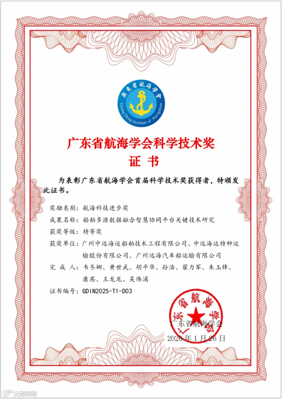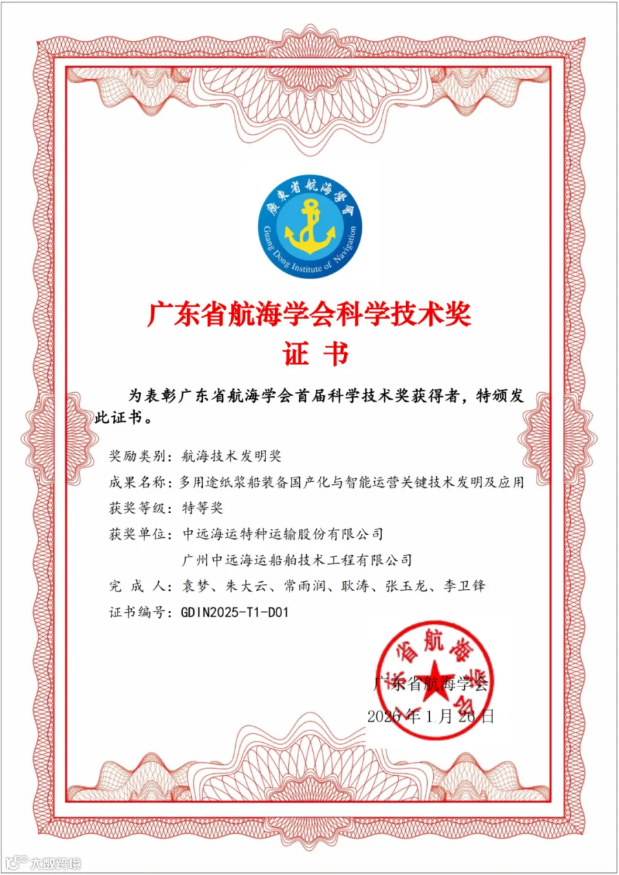 近期,广州中远海运船舶技术工程有限公司牵头及联合申报的两个项目凭借突出的技术创新与行业价值,双双获得广东省航海学会首届科学技术奖特等奖殊荣:一是与联合中远海运特运完成的“多用途纸浆船装备国产化与智能运营关键技术发明及应用”项目。二是联合中远海运特运、广州远海汽车船公司共同申报的“船舶多源数据融合智慧协同平台关键技术研究”项目。