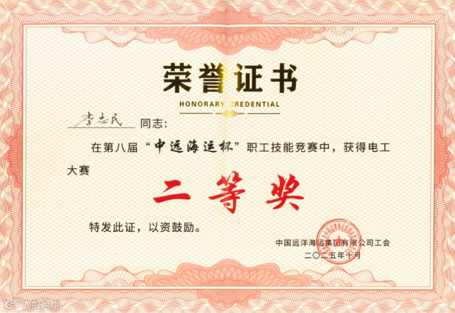 近日,江苏省海洋运输行业职业技能竞赛暨第八届“中远海运杯”职工技能大赛圆满落幕。本届大赛不仅是行业技术实力的集中检阅,更成为集团培育高素质技能人才的重要实践平台。本次大赛,公司员工李忠民代表中远海运特运参赛,凭借精湛技艺与稳定发挥,在电工项目比赛中脱颖而出,斩获二等奖,以实际行动诠释了特运人“精益求精、追求卓越”的工匠精神。
