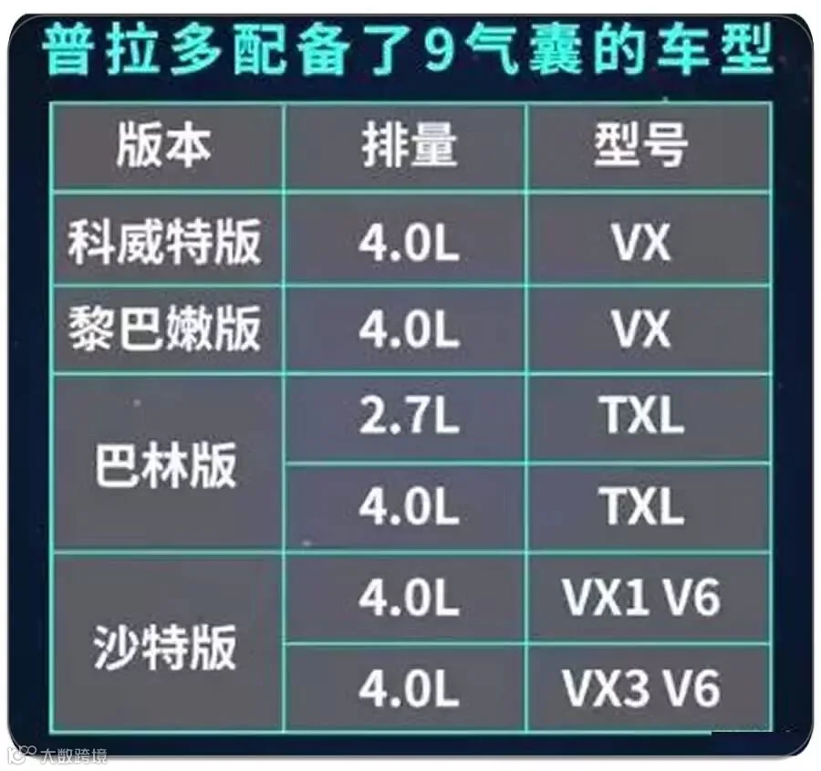 像是否配备了9气囊这个就很关键,可以重点关注一下以上图片中的6款带有9气囊车型哦!但9气囊大多都是4.0L的,如果在乎燃油经济性的话,那么图中巴林版2.7L也是一个最佳的选择。