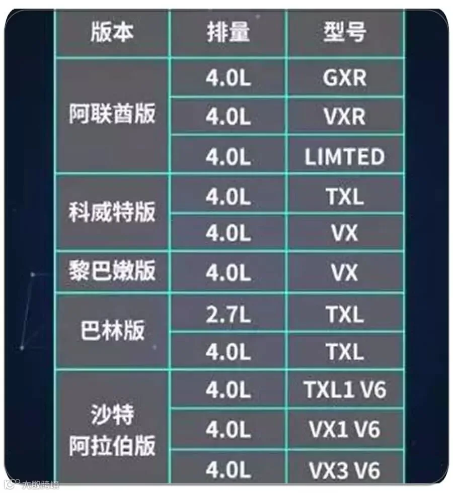而沙特阿拉伯班与科威特版,有都有2.7L TX车型,这两款车型又能从轮圈就能区分出来。