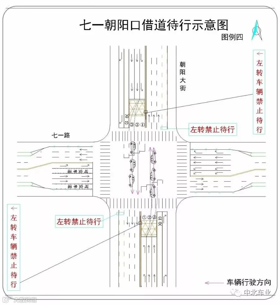 四、在南北方向直行时,南北方向左转车辆禁止待行。