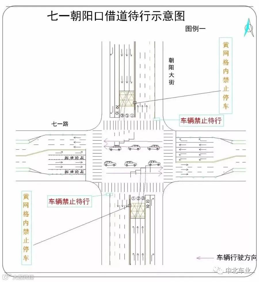 一、在东西方向直行时,南北方向车辆禁止待行。