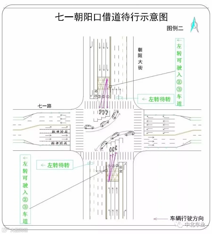 该方法合理利用时间、空间和信号配时,立足现状解决问题。鉴于朝阳大街通行压力较大,公安交警部门选择朝阳路与七一路交叉口作为试点进行改造。改造主要涉及两点变化,一个是道路‘空间’分配,利用直行道前方空间设置为左转待转和直行待行共用,提高左转车辆通行空间;另一个是调整原信号相位顺序,由‘先直行后左转’变为‘先左转后直行’,有效避开各相位间空间上、时间上的冲突。据测算,使用“借道待行”方法后,在一个信号周期,南北向左转可增加9-10辆车通过,有效缓解交通压力。
