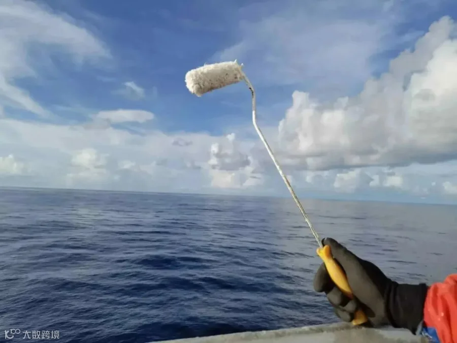这是去年我在漳州换班后水手长布置油漆作业前,配发的第一把油漆刷。刷头是易耗品,就像签字笔的笔芯一样已经不知道更换多少个了,而刷柄满身的迷彩见证了我和它的友谊:从艏楼甲板的锚机和锚链,到生活区外立面,再到主甲板的舱盖和栏杆……一晃已经将近4个多月了。每次完工,我举起心爱的油漆刷,和蓝天白云相映成趣,与其说是油漆刷,我更愿意称之为“水彩笔”,让我每一次的作品与大海上的美景争芳斗艳吧!