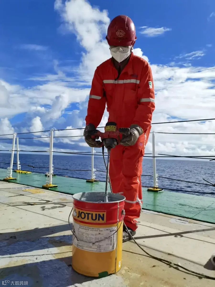 我是大德轮水头蒋花湘。跑船三十余年,见证了甲板劳动工具的升级换代,不能不提的就是油漆搅拌机。第一次在公司使用这种装备大概是二十年前,它的出现宣告了用简易棍调油漆的方法成为历史。油漆是船舶美容工作的最后一道工序,简单估算,一艘三万吨船舶需要日常油漆维护的面积,将近2个足球场那么大,且里外三层的包裹,油漆调配搅拌工作量可想而知。手里这款搅拌机绝对是我油漆工作必备的“好兄弟”。