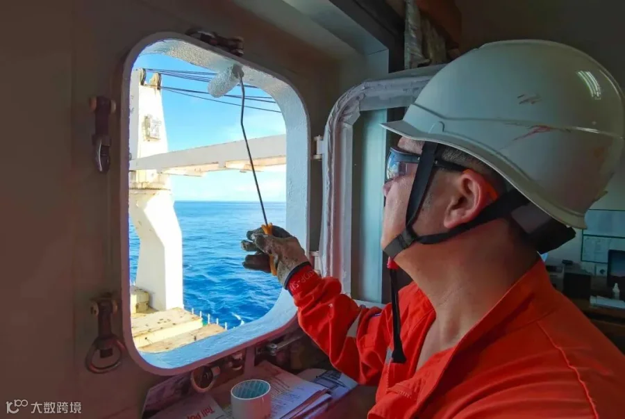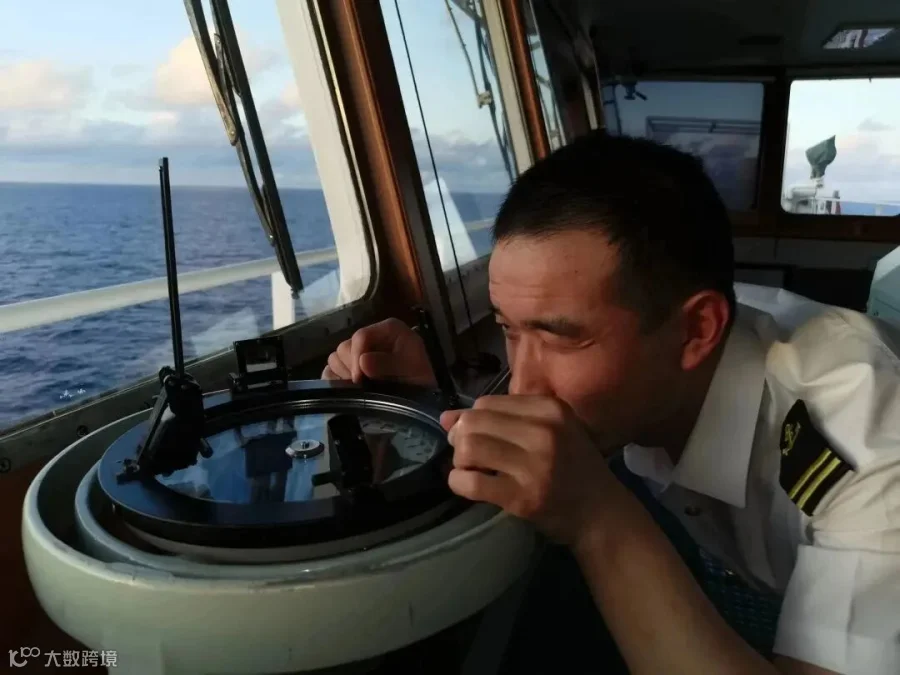 我是大德轮二副宋鑫洋。我双手紧握的是罗经方位圈,是电罗经的专用配套仪。即使航海发展了这么多年,各种电子助航仪器越来越先进,但是驾驶员依旧使用罗经方位圈。航行中无论是测陆标方位,还是测量太阳低高度方位角,驾驶员们都离不开它。简单可靠是它的特点,准确误差小是它的招牌。进出港的时候,船长、引水员也经常用电罗经来核对灯浮导标,确保船舶安全航行。