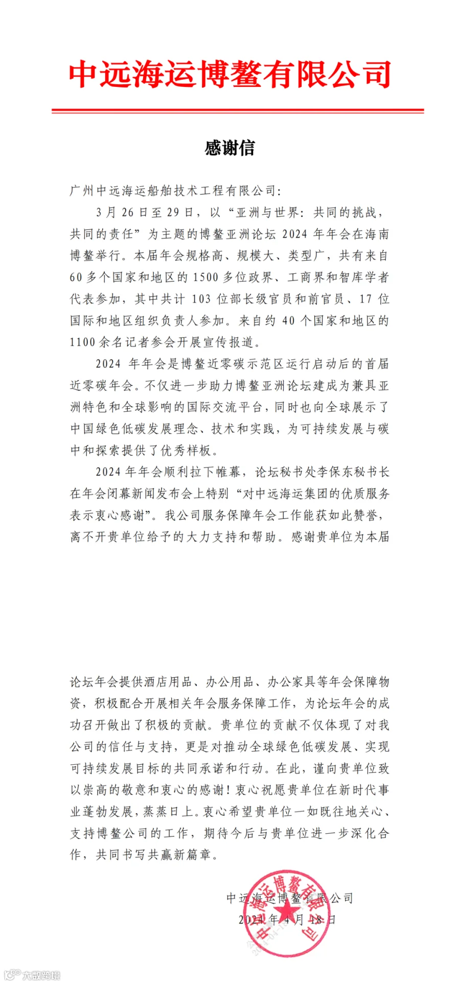 4月18日,广州中远海运船舶技术工程有限公司收到来自中远海运博鳌有限公司的感谢信,这是公司助力博鳌亚洲论坛圆满举办以来收到的第四封感谢信。