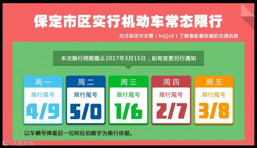 【周一至周五】分别限行尾号【4和9、0和5、1和6、2和7、3和8】,以车辆号牌最后一位阿拉伯数字为限行依据。