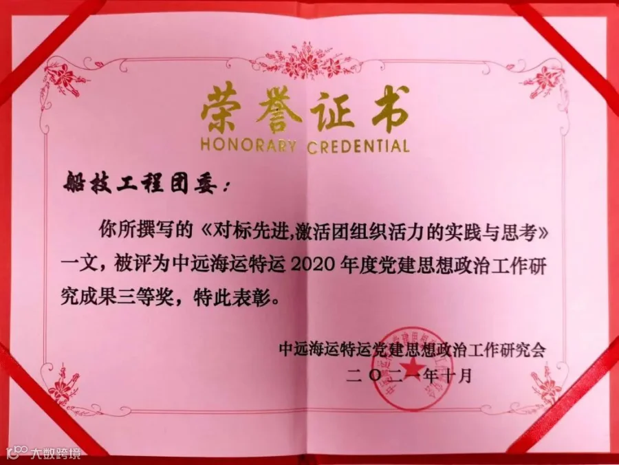 荣获2020-2021年度中远海运特运“五四红旗团支部”称号