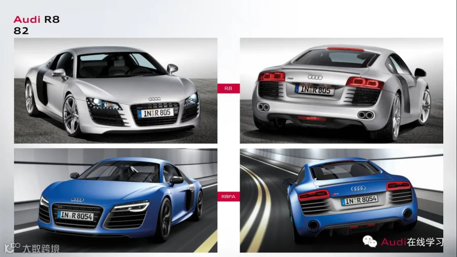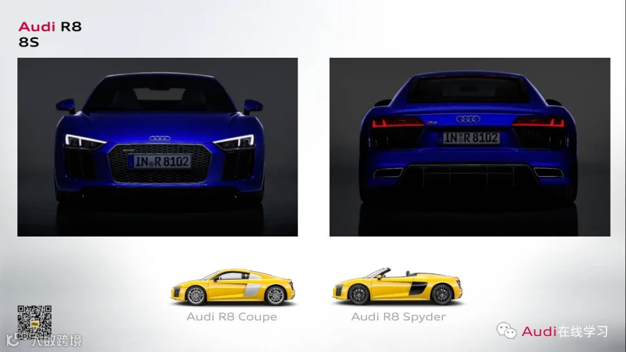 奥迪R8共有两款车型:Audi R8 Coupe和Audi R8 Spyder。
