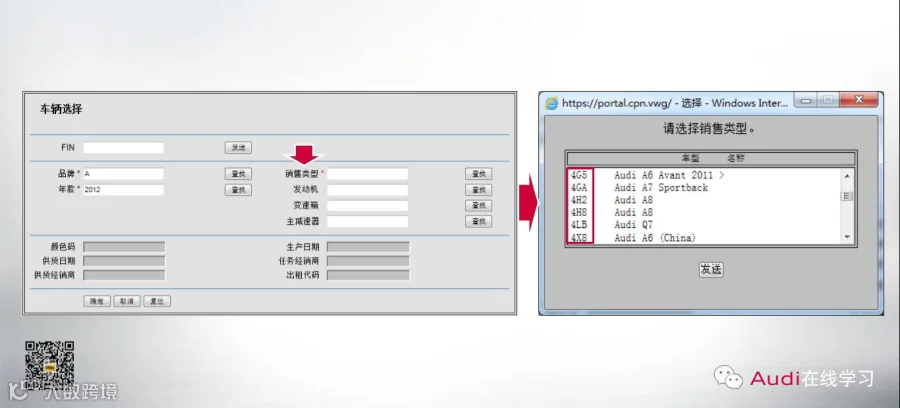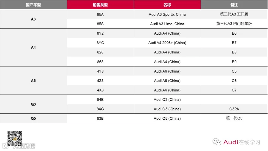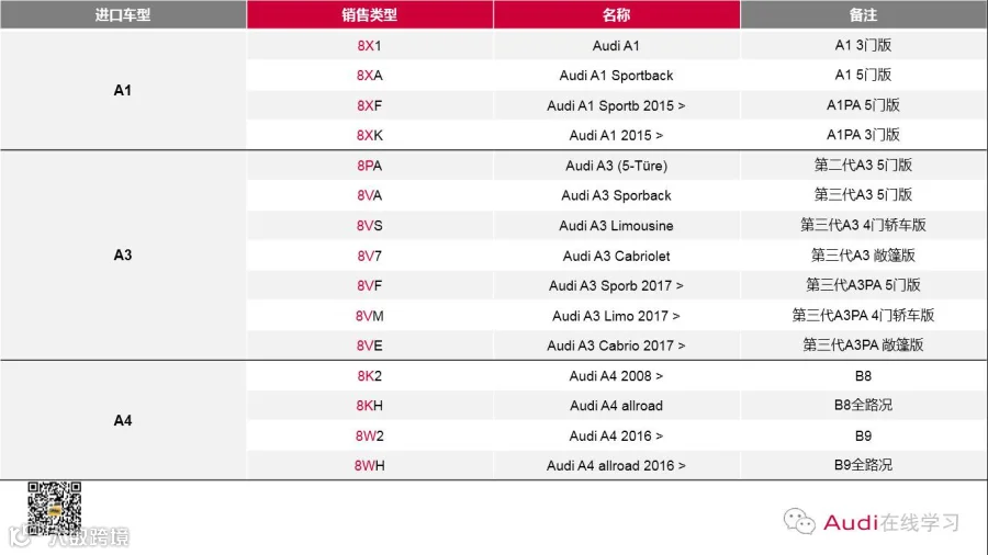 销售类型由三位数字或字母组成,前两位确定车型,最后一位用来区分车型的款式,且前两位都可以在底盘号中的第7、8位体现。详见车辆身份证-VIN。下面小编汇总了常用的奥迪车型销售类型,以供大家平时正确选择。