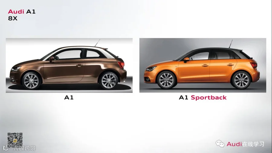 奥迪A1共有两种车型可以选择:奥迪A1和奥迪A1 sportback。通过上图你会发现,它们的区别是车门的数量,为了区分他们的叫法,Sportback也被称为5门版。