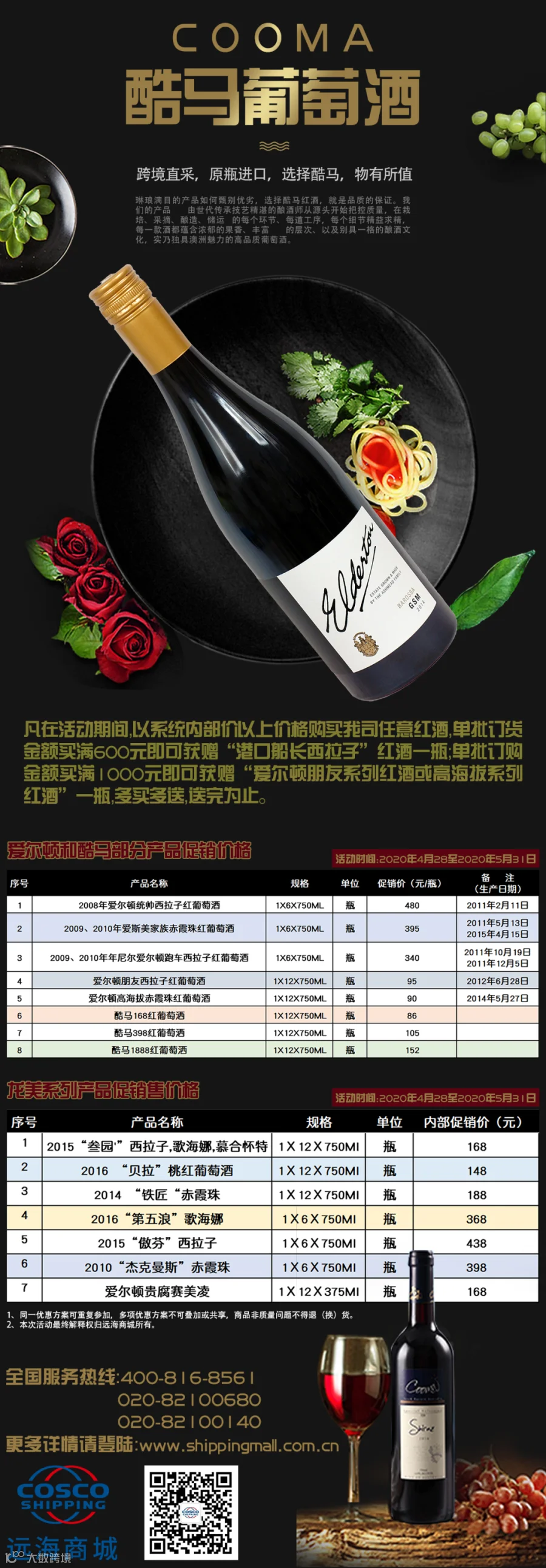 活动期间,购买任意红酒,单批订货金额买满600元即可获赠“港口船长西拉子”红酒一瓶;单批订购金额买满1000元即可获赠“爱尔顿朋友系列红酒或高海拔系列红酒”一瓶,多买多送,送完为止,所有特价红酒运费自理。