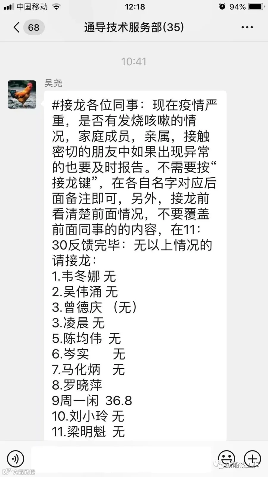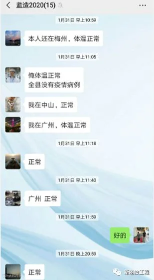 自1月23日起,船技工程全体员工坚持每日定时、定点健康打卡,通报自身健康状况,各部门经理作为第一负责人,每日在公司管理干部微信群汇总上报,切实将公司疫情防控工作部署落实到实处。