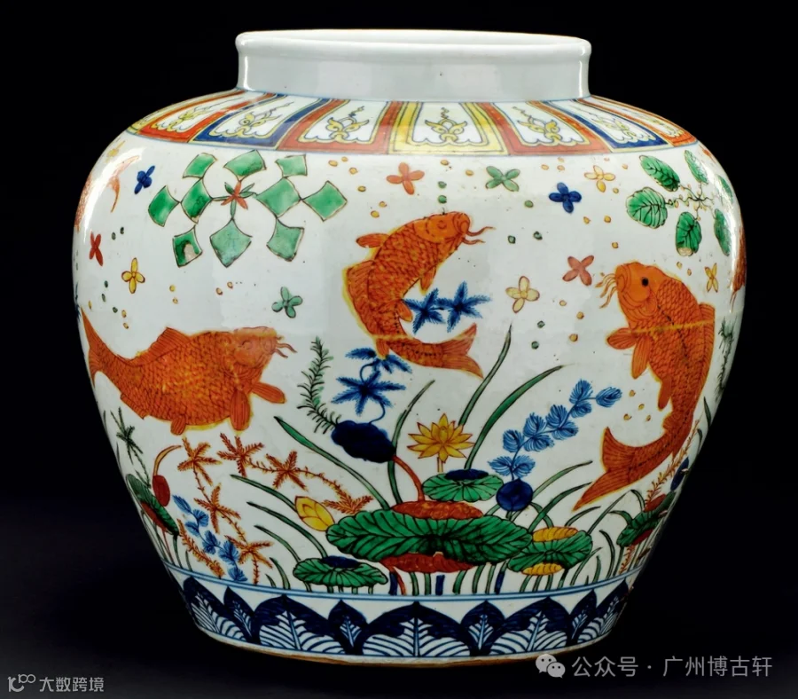 嘉靖一朝五彩御瓷冠绝一时,其彩画之诡奇,绘事之伟丽,称胜于明清两代,成为有明一代最为杰出的彩瓷之一,引领中国彩瓷之发展迈入另一巅峰时期。以本品为代表的五彩鱼藻纹大罐正是嘉靖五彩御瓷之翘楚,珍稀无比,为瓷史之重要名品,历来为藏家所推崇。本品造型敦实而秀润,肩部装饰一周五彩变形莲瓣纹,与胫部芭蕉叶相呼应。腹部主题纹饰池塘鱼藻纹,画中五彩金鱼浮游其中,鲜活跳跃于浮萍和水草之间,悠然自在,形态各异,水草妖娆浮动,虽无画水,而水自然而现。其施彩风格豪迈,繁缛华丽,色泽浓妍,变化丰富,红彩苍雅深沉,一如枣皮之色,为典型的嘉万彩瓷之特征,绿彩厚润而翠意闪现,极具厚实质感,绝无晚清仿品之飘浮黯淡,黄彩鲜明而不俗,仿若金箔贴附,绘饰诸鱼所用的橙红彩颇为独特,沉凝内敛,是由矾红与黄彩相混而成。总而言之,诸彩相配得当,相互辉映,显现嘉靖御窑五彩红妍绿翠的艺术特色,一如前人赞誉:“龙凤花草各肖形容,五彩玲珑极尽华丽”。所见诸鱼鳞鳍清晰,飘逸灵动,极具神采,虽其绘画之线条并非如明早期官窑或清代官窑那般工致细密,然则古拙有力,运笔恣肆而不失神韵,在鱼儿与水藻的空间分布上亦是十分自然,绘者似未刻意经营画面空间,然而此类“池塘小景”画面则给人意蕴无穷之感,因为它质朴自然的生动,得以更好展现诸鱼无拘无束之游姿。检阅当今公开的典藏资料,此式五彩鱼藻纹大罐除本品以外尚存不过10 例,至为珍罕,多为世界最顶级的博物馆收藏,其中原装盖者占四例,其收藏具体情况参见前文附表。作为嘉靖御瓷之最杰出的代表,此式五彩鱼藻纹罐的出现切实地提升了嘉靖官窑在中国陶瓷史上的地位,极大地改变明后期世人对嘉靖官窑的评价。清初叶梦珠于《阅世编》评阅:“磁器,除柴、定、官、哥诸窑而外,惟前朝之成窑、靖窑为最美,价亦颇贵。”叶氏为明末清初人,此见解正是代表晚明以来士人的审美结果。入清以后,嘉靖御瓷之五彩鱼藻图案深得清宫钟爱,康熙朝曾将之摹造在五彩瓷盘,并署款为“在川知乐”以昭示其寓意,亦成为有清一代显赫的名品。由此可观,嘉靖五彩鱼藻罐对后世影响之深远。