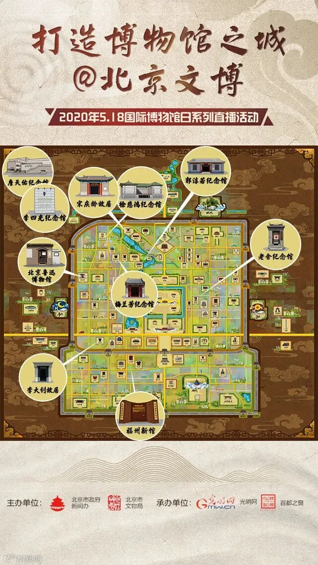 宋庆龄故居、李大钊故居、北京鲁迅博物馆、郭沫若纪念馆、老舍纪念馆、徐悲鸿纪念馆、梅兰芳纪念馆、詹天佑纪念馆、李四光纪念馆、福州新馆等10家名人故居纪念馆将接力直播,通过市政府新闻办和市文物局官方微博微信,光明网、首都之窗和一直播平台发布推广。活动还将围绕参与直播的博物馆推出系列短视频等产品,借助多元化的新媒体平台,带领更多公众追溯文物背后的历史,了解博物馆里的故事,感受“近在咫尺”的博物馆。