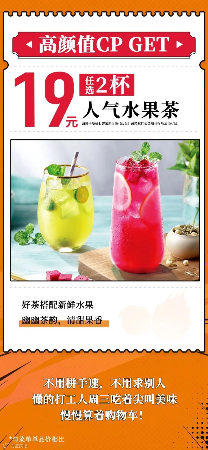 “尖叫星期三”本轮活动期间(11月4日,11月11日,11月18日,11月25日),在指定必胜客欢乐餐厅可以如下单品价点购对应的指定产品:人气水果茶(粒粒红心金铂兰香乌龙(冰/温)、清雅卡曼橘七窨茉莉白毫(冰/温),任选)- 19元/2份;香草凤尾虾- 29元/7只;澳洲谷饲牛肉比萨- 39元/份。本活动仅适用于堂食和自助点餐渠道,宅急送渠道除外。产品及包装以实物为准,具体产品及价格以餐厅菜单为准,图示内容仅供参考。必胜客牛排系列产品所使用的原料肉为进口的整块牛肉,在国内采用现代工艺进行了精心调制。牛排系列产品所用餐盘请以餐厅实际供应为准。牛肉产地因产品批次不同而有所差异,请以餐厅实际供应为准。本活动有关优惠权益不与任何未标明“可与其他优惠共享”的权益共享。本活动不适用于机场、火车站、高速公路、旅游度假、游乐场、展览馆、Bistro 、Express、奥特莱斯、佛罗伦萨、精选餐厅以及必胜客部分特定餐厅,详洽餐厅。广告内容仅供参考,产品及包装请以实物为准。