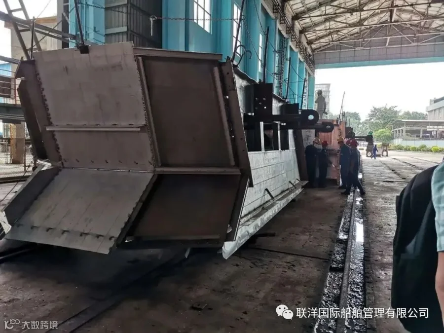 6月18日08:40监造组陪同业主、厂方深入现场了解施工进度,对船体分段进行察看
