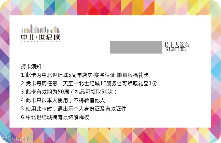 活动期间,在中北世纪城购物满100元,均可至中北世纪城1F服务台,凭身份证免费办理价值100元“福礼卡”1张,限量2019份,凭卡每周均可至世纪城1F服务台领取礼品1份,可连续领50周;(每次领取袜子2双);