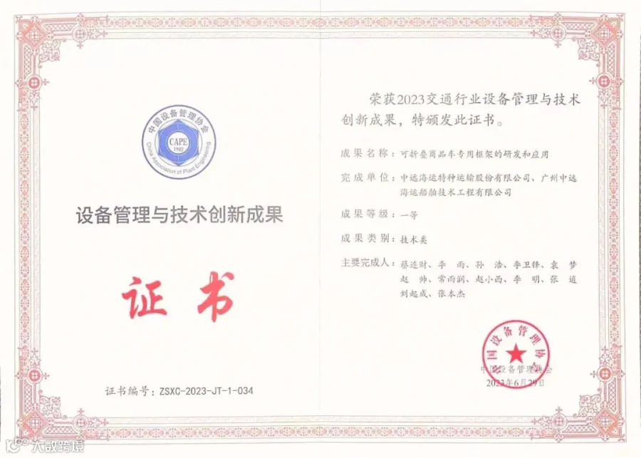 中远海运特运与船技工程联合申报的创新成果《可折叠商品车专用框架的研发和应用》荣获中国设备管理协会“2023交通行业设备管理与技术创新成果”一等奖