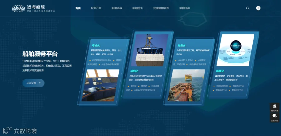 实施开发“远海船服”平台,集通信导航全产业链、吊梁吊具及货运工装研发设计、海洋工程及海洋运输、船舶数字化等服务解决方案,船舶设备备件供应,需求订单询价比价,船舶数智产品应用于一体的船舶类综合服务平台