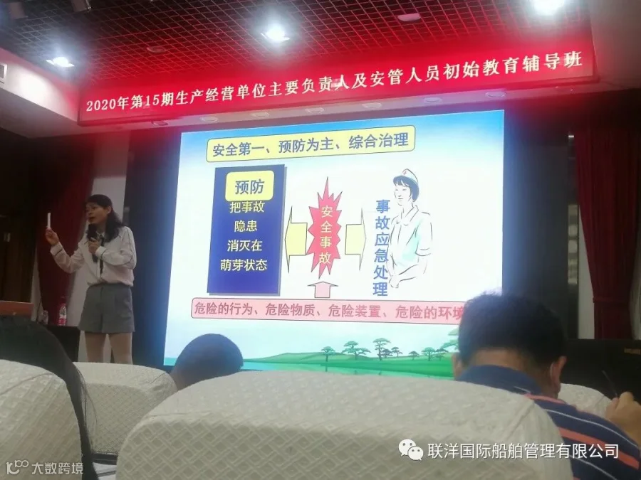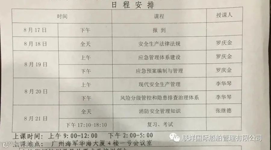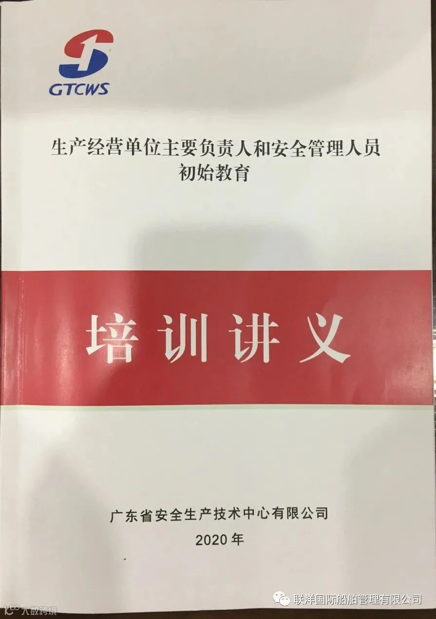 8月17日至8月21日,广州联洋国际船舶管理有限公司管理班子四人参加了由广东省安全生产技术中心有限公司在广州市海军华海大厦4楼1号会议室举办的《2020年第15期生产经营单位主要负责人及安管人员初始教育辅导班》。