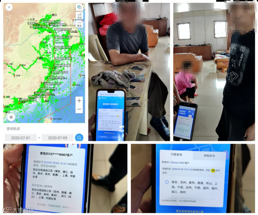 执法人员仔细检查发现该船并不能出具本船的货物舱单。谨慎的执法人员随即查询了“中**”轮的船舶轨迹,发现“中**”轮于7月1日自广州至开往天津,并未在南通过驳区停泊,船舶出具的运单和舱单影印件并不属实。接着,执法人员对船主和船上船员的近期手机行程进行核实,发现均在14天内有到达过浙江和福建的轨迹。至此,南京海事局执法人员对该船涉嫌超航区航行行为进行了锁定,并进一步调查。