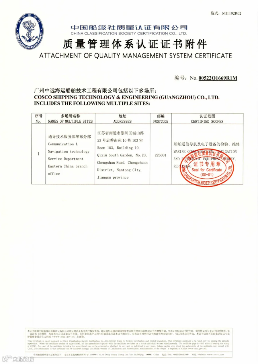 2022年5月,中国船级社质量认证有限公司对船技工程管理体系运行情况进行了再认证审核。通过审核,审核组一致评定,公司质量管理体系符合GB/T19001-2016/ISO9001:2015标准,我司质量管理体系认证再认证审核顺利通过。本次质量管理体系认证的范围包括:船舶和港口装卸用吊具的制造(OEM)、新造船舶监造服务;船舶通信导航及电子设备的安装、调试、检验、修理和设备、零备件的供应。