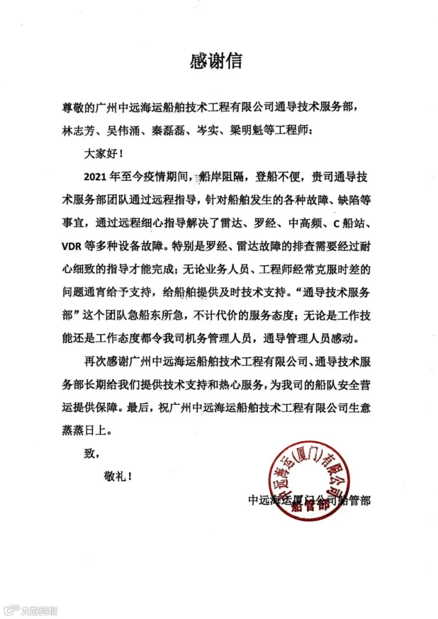 近日,船技工程收到中远海运(厦门)公司船管部感谢信,对我司工程师远程指导的专业态度给予了高度赞誉,对我司通导技术服务部工程师及业务人员为他们长期提供的技术支持和热心服务表示诚挚感谢。