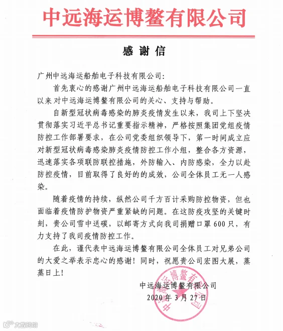 近日,船技工程公司收到来自中远海运博鳌有限公司发来的感谢信,信中指出:“随着疫情的持续,纵然公司千方百计采购防控物资,但也面临着疫情防护物资严重紧缺的问题,在这防疫攻坚的关键时刻,贵公司雪中送碳,以邮寄方式向我司捐赠口罩600只,有力支持了我司疫情防控工作。”