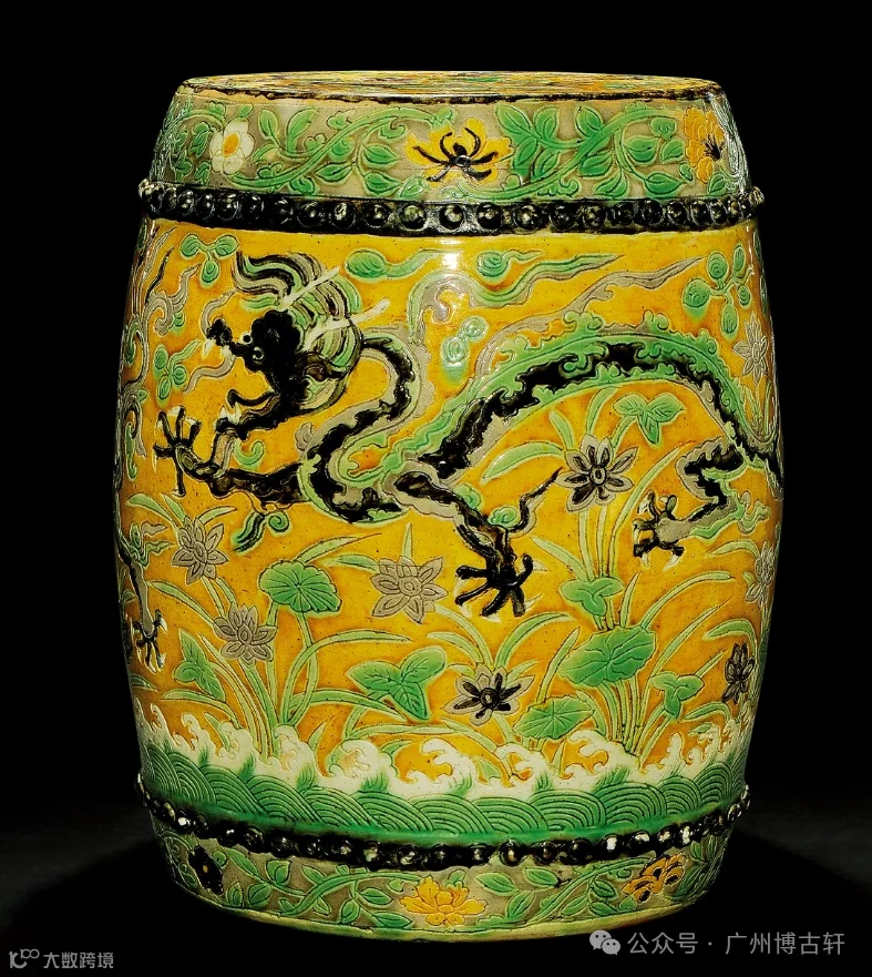 此绣墩呈鼓形,器形硕大恢弘,两道鼓钉纹将腹部纹饰分为三层,鼓钉一周上紫彩;腹中部以黄地为底,绘绿彩加紫彩荷塘穿花龙纹,下承海浪纹,似海水江崖上双龙盘旋,双龙细长弯曲,张牙舞爪,气势威猛。腹部鼓钉上下绘绿彩牡丹花卉纹。剔刻、添彩技法娴熟老辣,釉色亮青、硬度感强。器形硕大,釉面厚润,古拙感强。造形纯朴,给人以稳重厚实之感。其外壁纹饰装饰均采用赭石色和绿色、搭配以紫色,色彩古朴素雅,纹饰布局疏密得体。黄彩浓艳,绿彩鲜亮,与深沈的紫彩形成鲜明对照,其中绿彩色调偏向孔雀绿,为明代素三彩的特征,纹饰布局对清代官窑黄地素三彩品种具有重大影响。