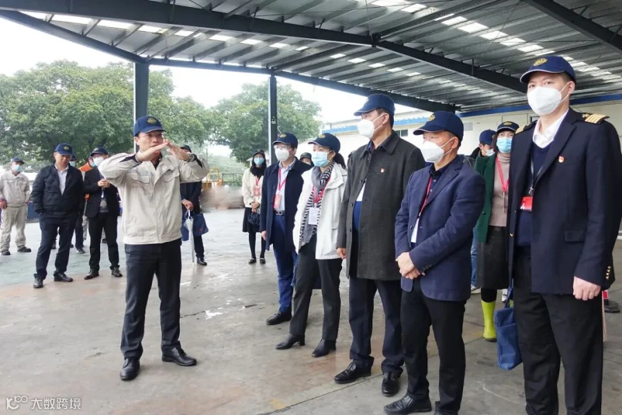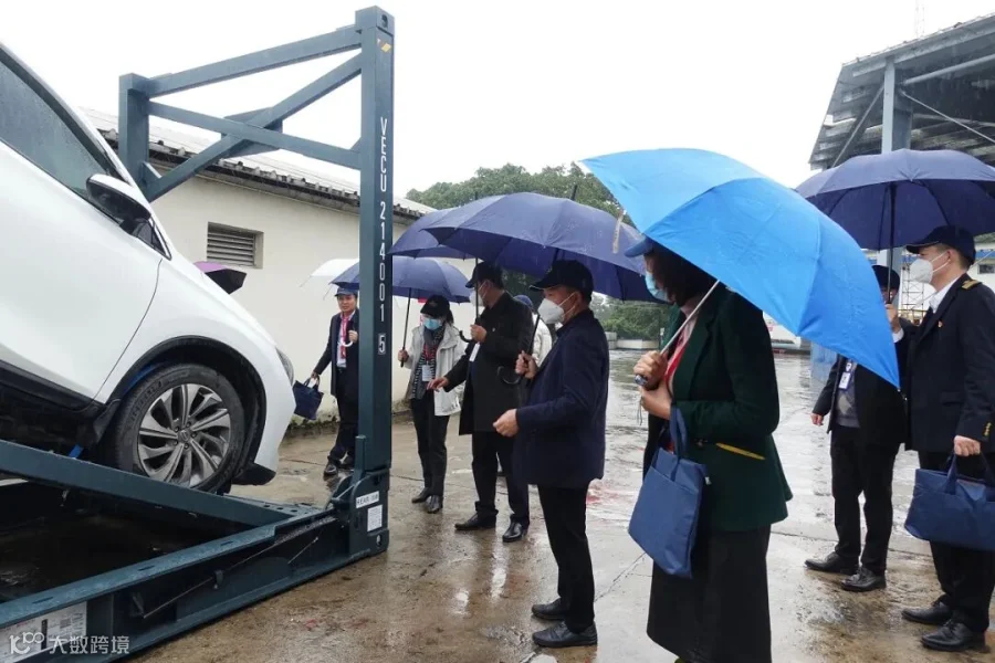 代表们深入华坑路仓库商品车装箱绑扎培训基地,现场视察商品车斜拉装箱和V-RACK大型车框架装箱工作情况。公司专项负责人方镇铭详细介绍装车绑扎流程以及公司助力特运“国车出海”战略实施工作开展情况,让代表们加深了港航服务保障行业对经济发展贡献的认识,得到了代表们的一致肯定。
