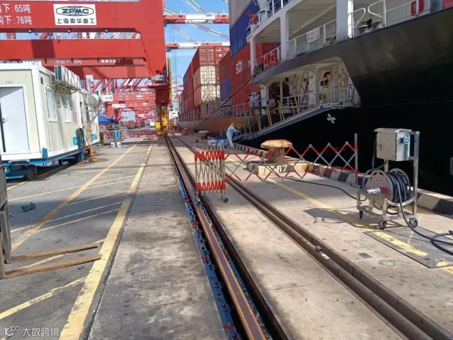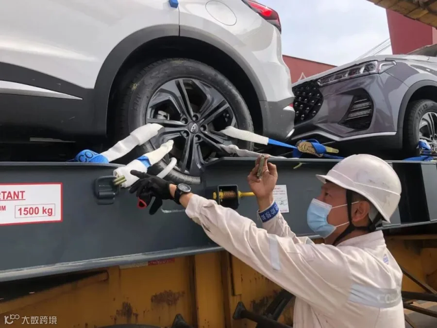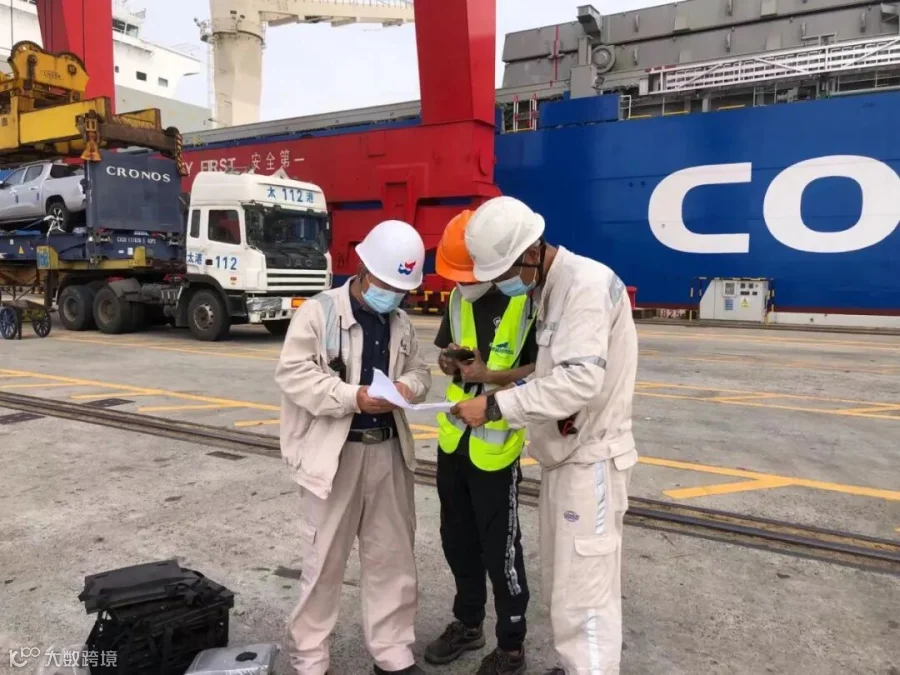 上午11:10,在太仓港,“中远海运源泉轮”9月30日晚开始框架箱装船,汽车装箱小组人员正在为已完成装车的可折叠框架箱和汽车进行复检工作,保障质量、保障安全。
