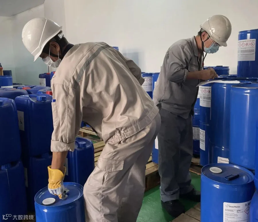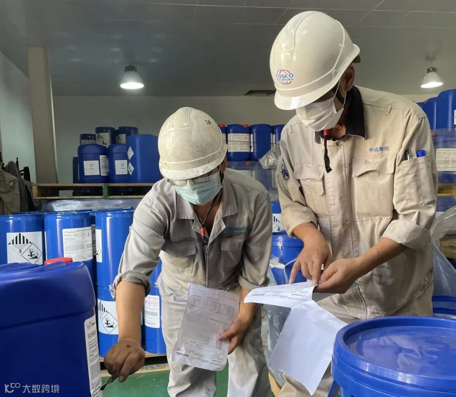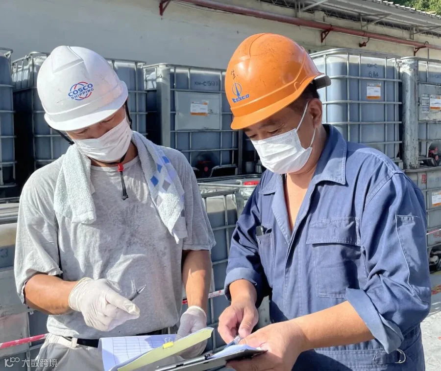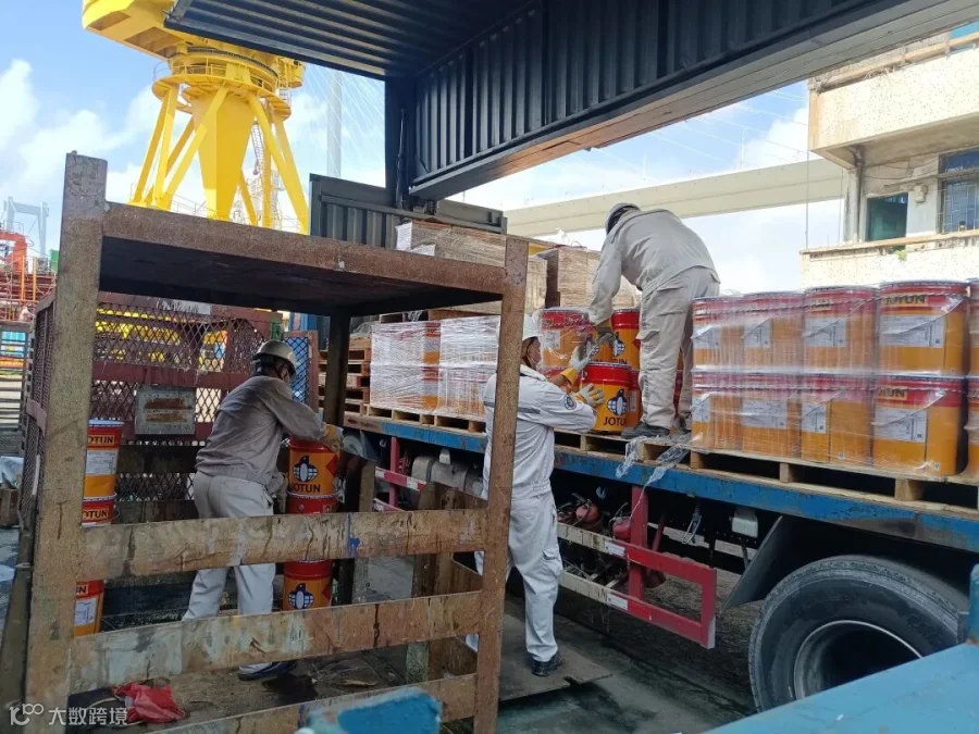 上午10:15,在菠萝庙船厂,送料员们正在为“腾池”轮供应坞修油漆,保障客户修船进度。