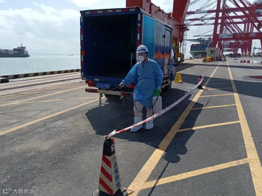 上午09:40,在南沙三期码头,送料员正在为配送“陆亚斯索”轮油漆和车辆进行防疫消杀工作。