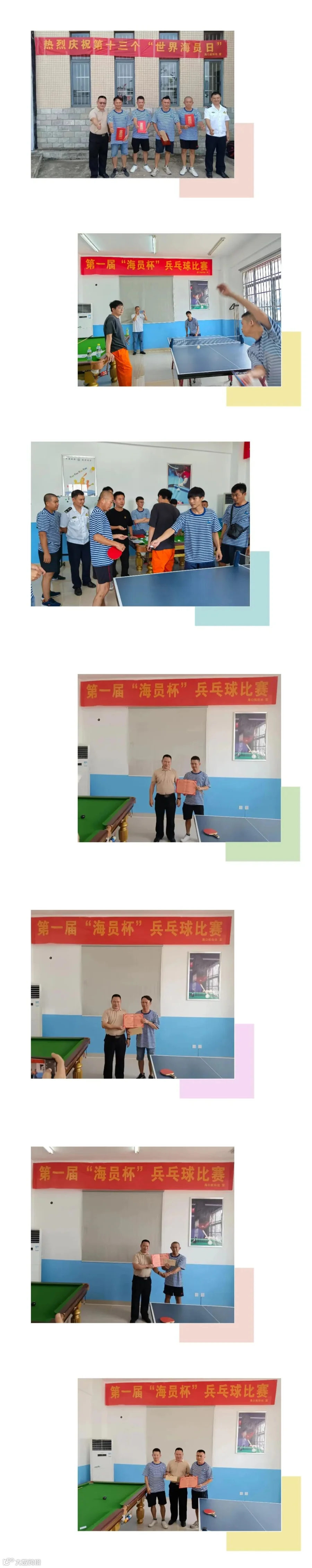 第一届“海员杯”兵乓球比赛,组织全体船员开展兵乓球比赛。竞赛项目分团体双打赛和男子单打比赛。赛制:比赛执行中国乒乓球协会审定的最新《乒乓球竞赛规则》;团体比赛采用五场三胜制,每场比赛采用五局三胜制,每局11分;根据报名人数(队)的多少决定赛制;球拍覆盖物不能经过物理或化学的处理。比赛结果分团体赛第 1 名;单打比赛前3名,分别以奖状和不同金额进行奖励,以示表彰。