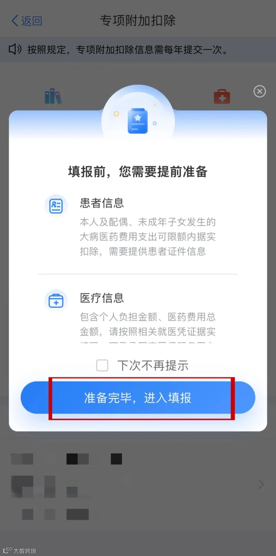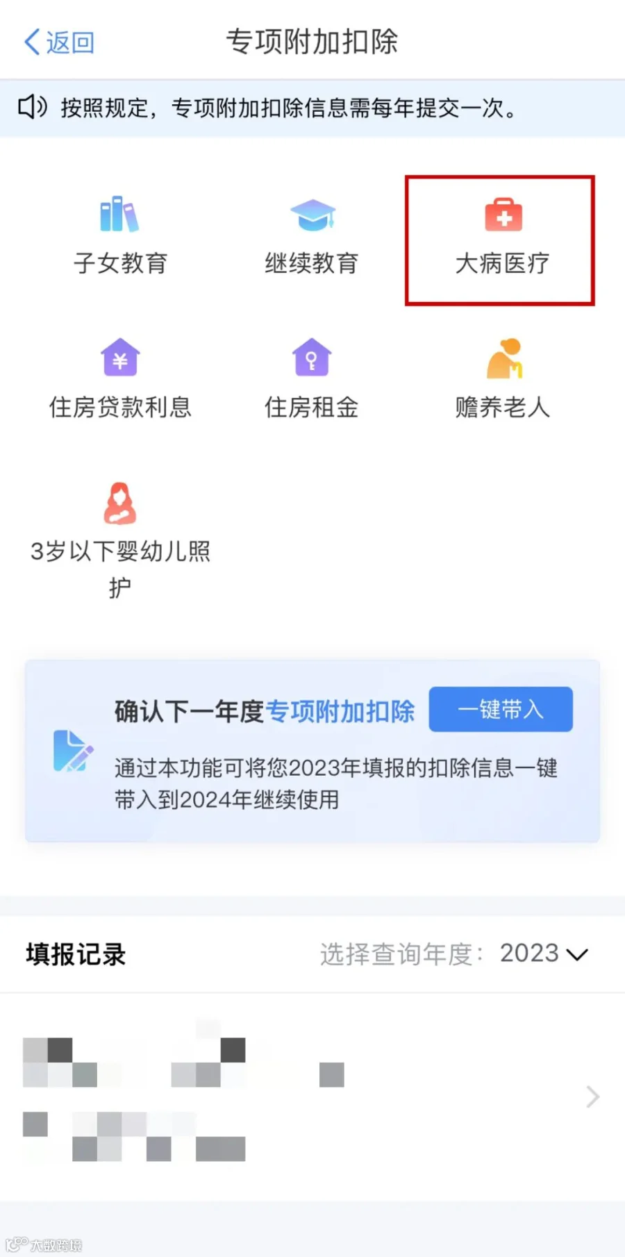 点击【大病医疗】→选择扣除年度→【准备完毕,进入填报】;