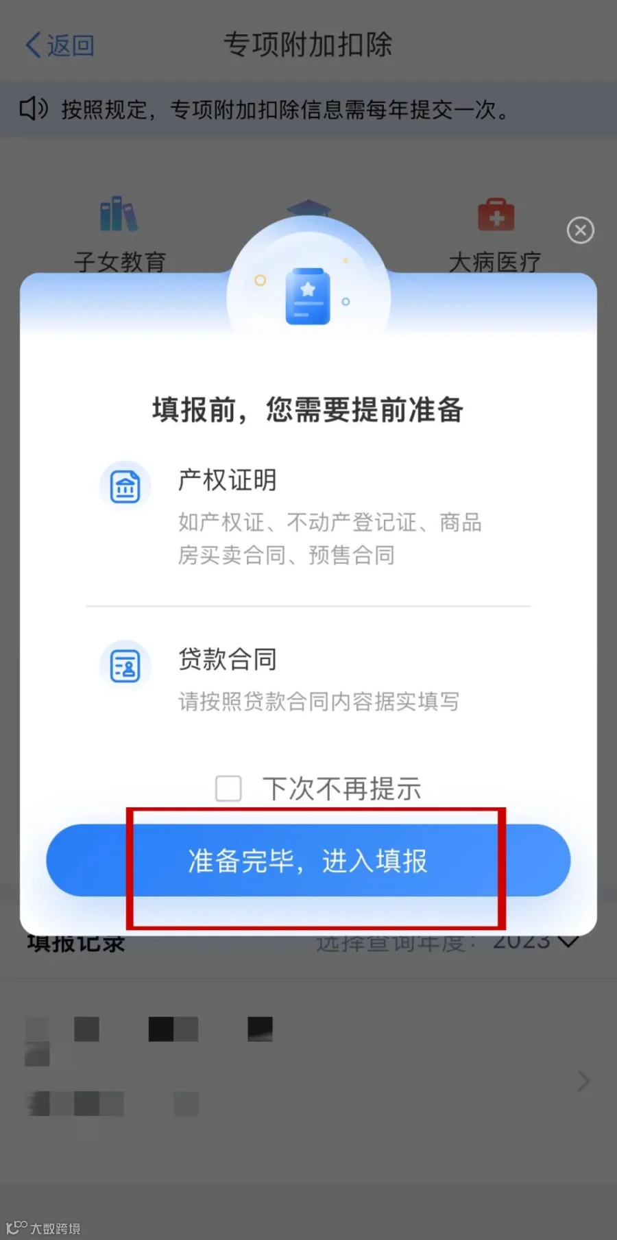 点击【住房贷款利息】→选择扣除年度→【准备完毕,进入填报】;