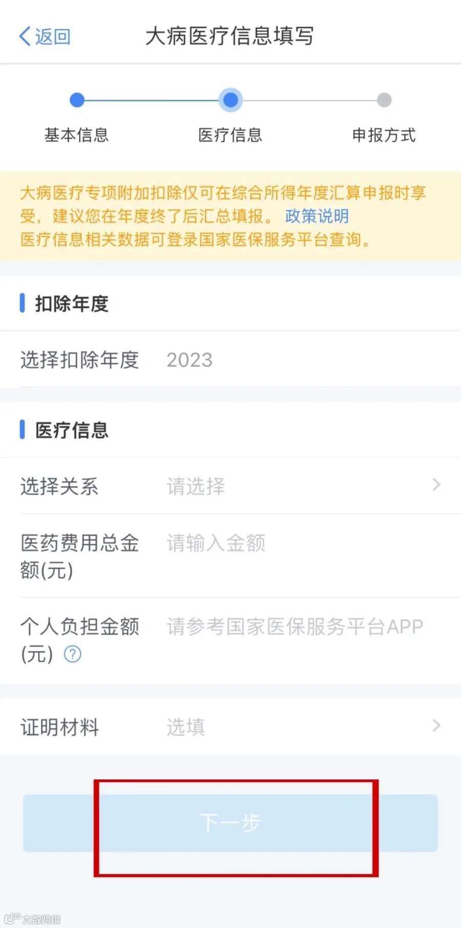 根据实际情况选择与纳税人的关系、医药费用总金额等,根据系统提示点击【下一步】,一步步填写资料,最后【提交】即可。